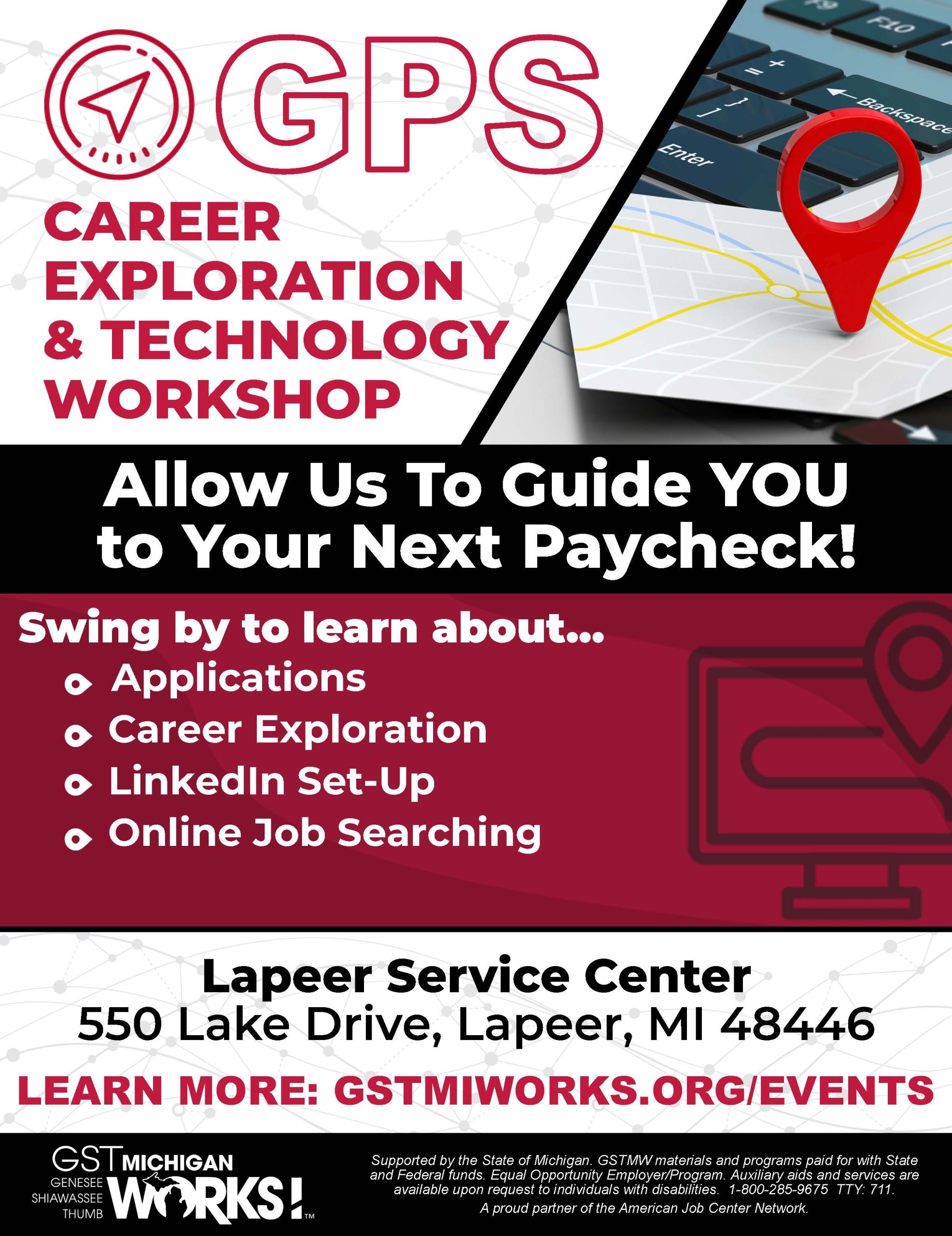 Allow us to lead you to your next paycheck! On Thursday, May 11th from 9 am to 12 pm, visit our Lapeer Service Center for help with a variety of services such as Career Exploration, online job applications, job search with a smartphone, learning how to use social media to job search, and creating a professional LinkedIn account.